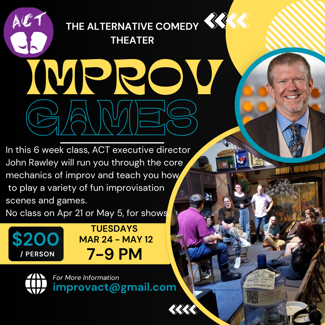 WHAT: Whose class is it anyway? Yours! In this 6 week class, ACT executive director John Rawley will run you through the core mechanics of improv and teach you how to play a variety of fun improvisation scenes and games.